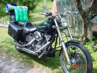荷物を積んだ様子。サイドバックは左右両方についている。この荷物プラス人間が二人。 明らかに過積載な気がする。 |