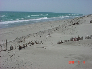 地図に砂丘があると書いてあったので行ってみたのですが、着いたのは目的の所と違ってたみたいです。 (あとで確認したら知らぬ間に通り過ぎちゃってたみたい) 「砂丘」の看板があったから向かってみたけど騙されました。 砂丘というより砂浜。 しかしものすごい高さで確かに「砂の丘」には一部なってました。写真ではわかりずらいけどかなり高い所から撮ってます。登るのがきつかった。 |